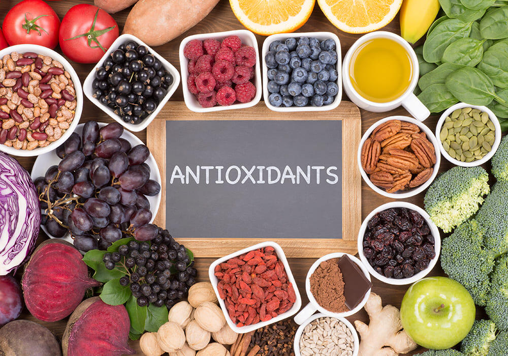 Antioksidan yang paling umum adalah vitamin C, vitamin E, dan beta-karoten. Sumbernya, seperti buah-buahan, sayuran, dan biji-bijian.