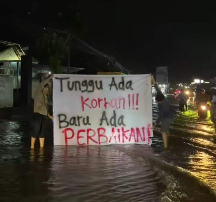 Spanduk tersebut berisi pesan keras kepada pemerintah terkait banjir yang tak kunjung tertangani.