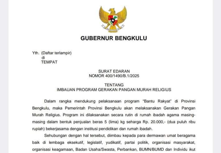Bengkulu, mediabengkulu.co – Pemerintah Provinsi Bengkulu resmi meluncurkan Program Gerakan Pangan Murah Religius sebagai bagian dari upaya mendukung program Bantu Rakyat.