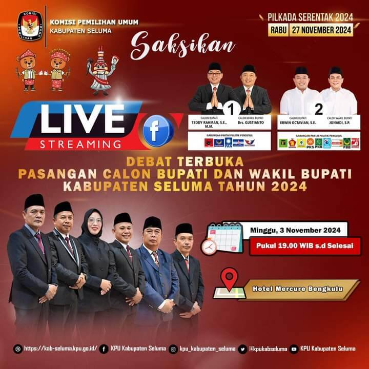 Seluma, mediabengkulu.co – Komisi Pemilihan Umum Kabupaten Seluma akan menggelar debat terbuka antara kandidat pasangan calon Bupati dan Wakil Bupati Seluma, yang dilaksanakan di Hotel Mercure Kota Bengkulu, pada tanggal 3 November 2024.