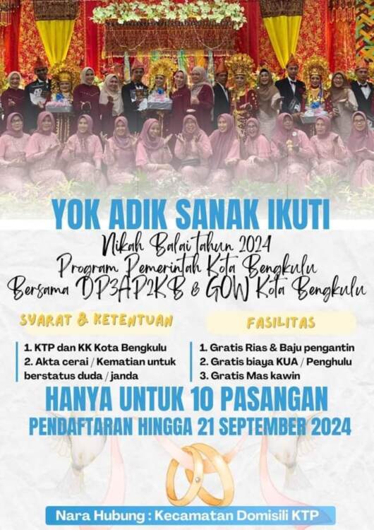 “Baik agama, adat dan negara akan tetapi mereka terkendala dengan biaya. Maka Pemerintah Kota Bengkulu hadir dengan program nikah balai masal gratis ini,” ungkap Yasdewita, Jumat (20/9/2024).