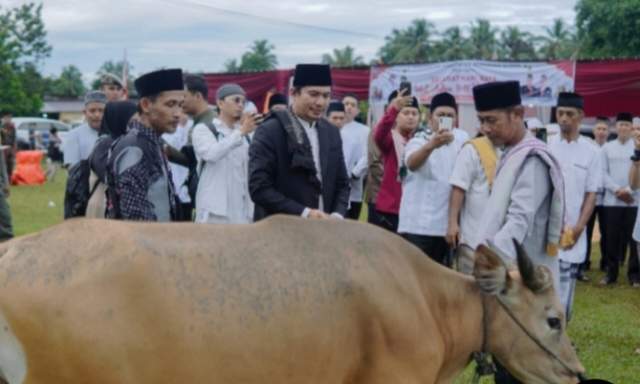 Bupati Bengkulu Utara, Arie Septia Adinata, menyerahkan dua ekor sapi kurban untuk dibagikan kepada masyarakat Padang Jaya.
