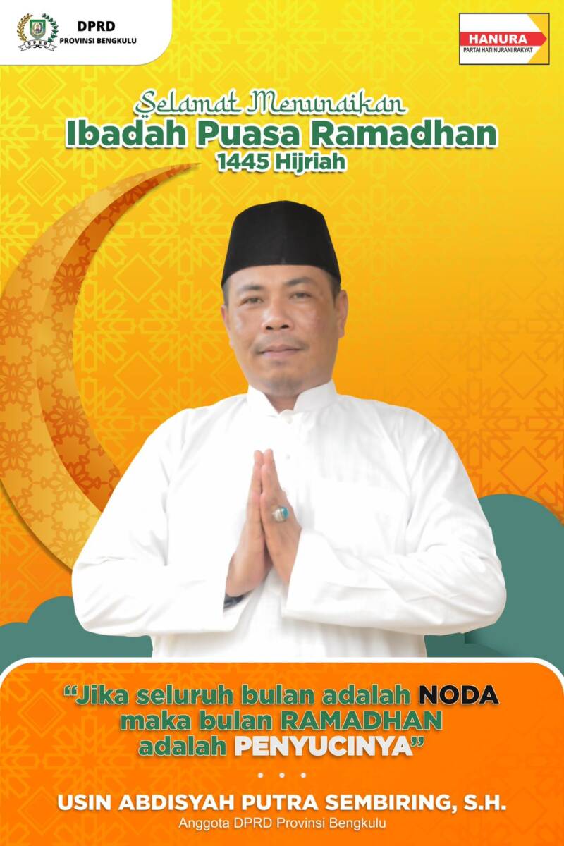 Bengkulu, mediabengkulu.co – Anggota Dewan Perwakilan Rakyat Daerah (DPRD) Provinsi Bengkulu, Usin Abdisyah Sembiring,SH dengan tulus mengucapkan selamat menyambut bulan suci Ramadan 1445 H/2024 M kepada seluruh masyarakat Bengkulu.