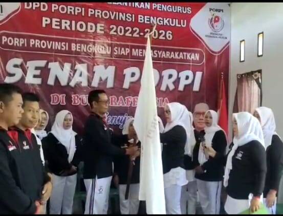 Penyerahan Bendera PORPI dari perwakilan DPN PORPI kepada Ketua DPD PORPI Provinsi Bengkulu, Ansor Setia Budi ( fhoto Mediabengkulu .co)