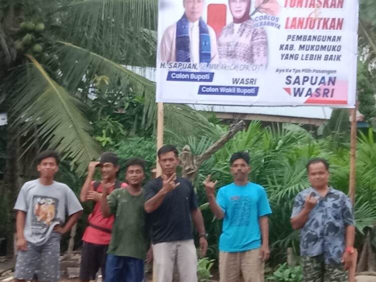 ‘’Baliho yang dicetak warga kemudian dipasang ramai-ramai dengan cara gotong-royong, ini bentuk antusias warga yang menginginkan kembali Sapuan – Wasri memimpin Kabupaten Mukomuko,’’ ungkap Kemardi.