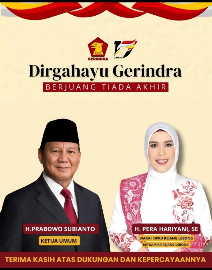 Rejang Lebong, mediabengkulu.co – Wakil Ketua I DPRD Rejang Lebong, Pera Haryani Politisi Partai Gerindra, mengucapkan selamat Hari Ulang Tahun Partai Gerindra ke-17 pada 6 Februari 2025.
