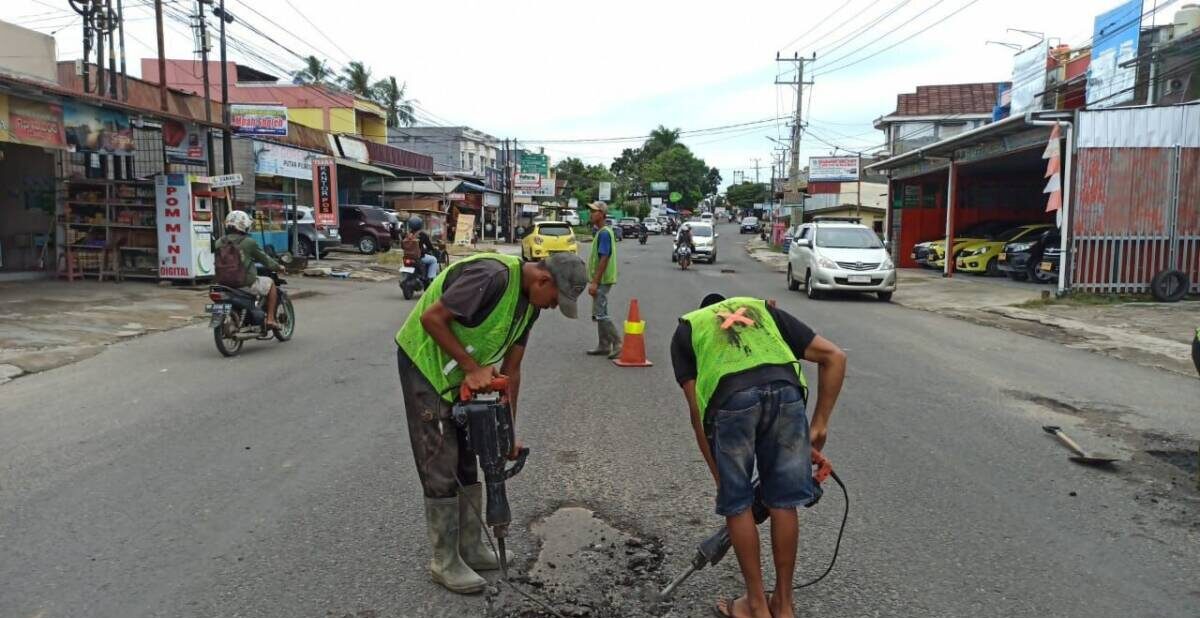 Pengerjaan jalan berlubang, yang berlokasi tidak jauh dari Simpang Padang Harapan ini, dengan cara tambal sulam.