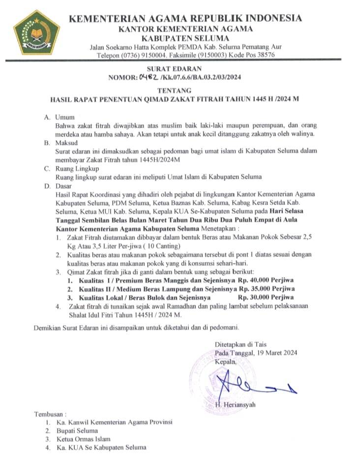Seluma, mediabengkulu.co – Kantor Kementerian Agama Kabupaten Seluma mengeluarkan surat edaran nomor: 0482/KK.07.6.6/BΑ.03.2/03/2024, tentang hasil rapat penentuan qimad zakat fitrah tahun 1445 H/2024 M, tanggal 19 Maret 2024.