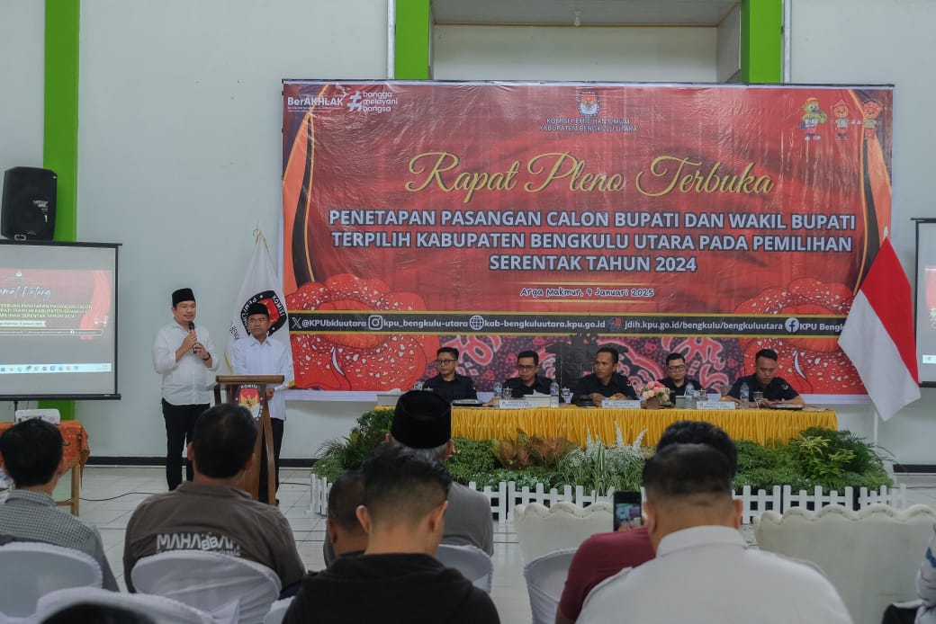 “Komisi Pemilihan Umum Kabupaten Bengkulu Utara menetapkan pasangan calon Bupati dan Wakil Bupati Bengkulu Utara nomor urut 1, saudara Arie Septia Adinata dan Sumarno sebagai Bupati dan Wakil Bupati terpilih Bengkulu Utara terpilih periode 2025-2030,” kata Santoso.