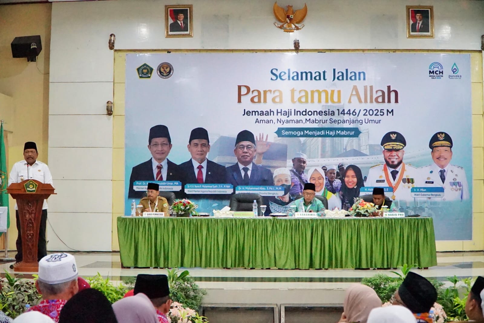 Wakil Gubernur Bengkulu, Mian, melepas keberangkatan Jemaah Calon Haji Kloter II asal Bengkulu yang tergabung dalam Kloter III Embarkasi Padang, di Asrama Haji Bengkulu, Selasa (6/5/2025). (foto:dok/ist)