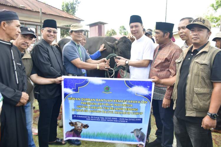 Rejang Lebong, mediabengkulu.co – Dalam menyambut Hari Raya Idul Adha 1445 H, Bupati Rejang Lebong, Fikri Thobari, menyerahkan secara simbolis sapi qurban yang merupakan bantuan dari Presiden RI, Gubernur Bengkulu, dan Pemkab Rejang Lebong, Sabtu (7/06/2025).