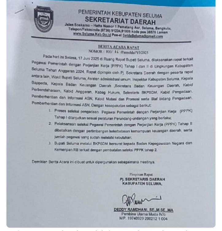 Pembatalan seleksi PPPK berdasarkan hasil rapat tim anggaran pemerintah daerah yang dilaksanakan pada Selasa 17 Juni 2025.