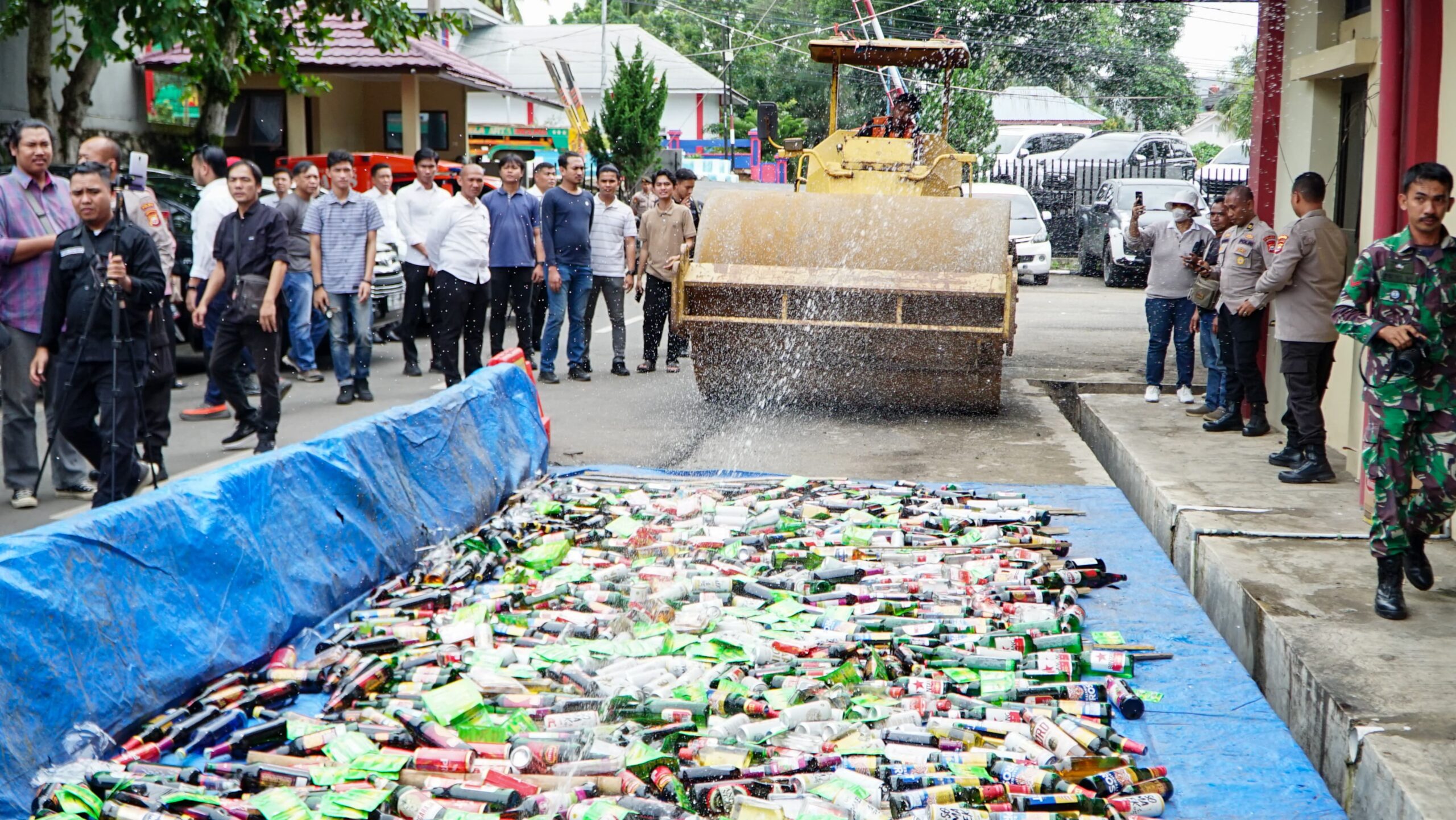 Ribuan botol miras, rokok dan makanan serta minuman hasil sitaan tersebut digilas menggunakan alat berat jenis buldozer.