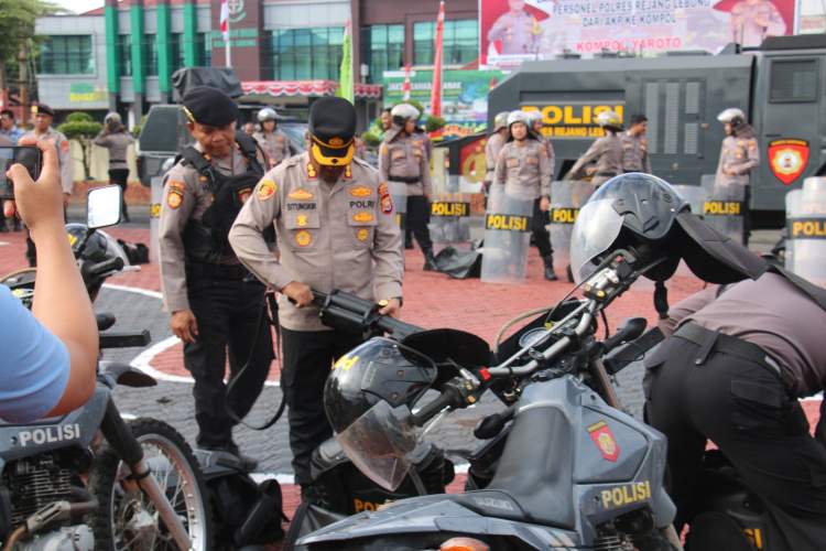 Mereka melakukan pemeriksaan menyeluruh terhadap kehadiran personel, kondisi kendaraan khusus, serta kesiapan dan kelengkapan peralatan Dalmas.
