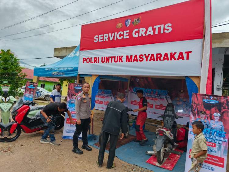Direktorat Lalu Lintas Polda Sumatera Barat membuka layanan servis sepeda motor gratis di Desa Asam Pulau, Kecamatan Kayutanam, Kabupaten Padang Pariaman, Minggu (28/12/2025).
