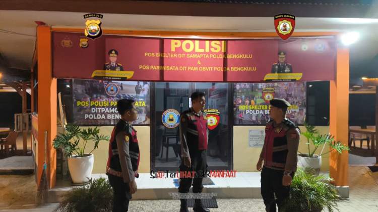 Bengkulu, mediabengkulu.co – Pos Shelter Ditsamapta Polda Bengkulu terus siaga 24 jam menjaga keamanan Pantai Panjang.