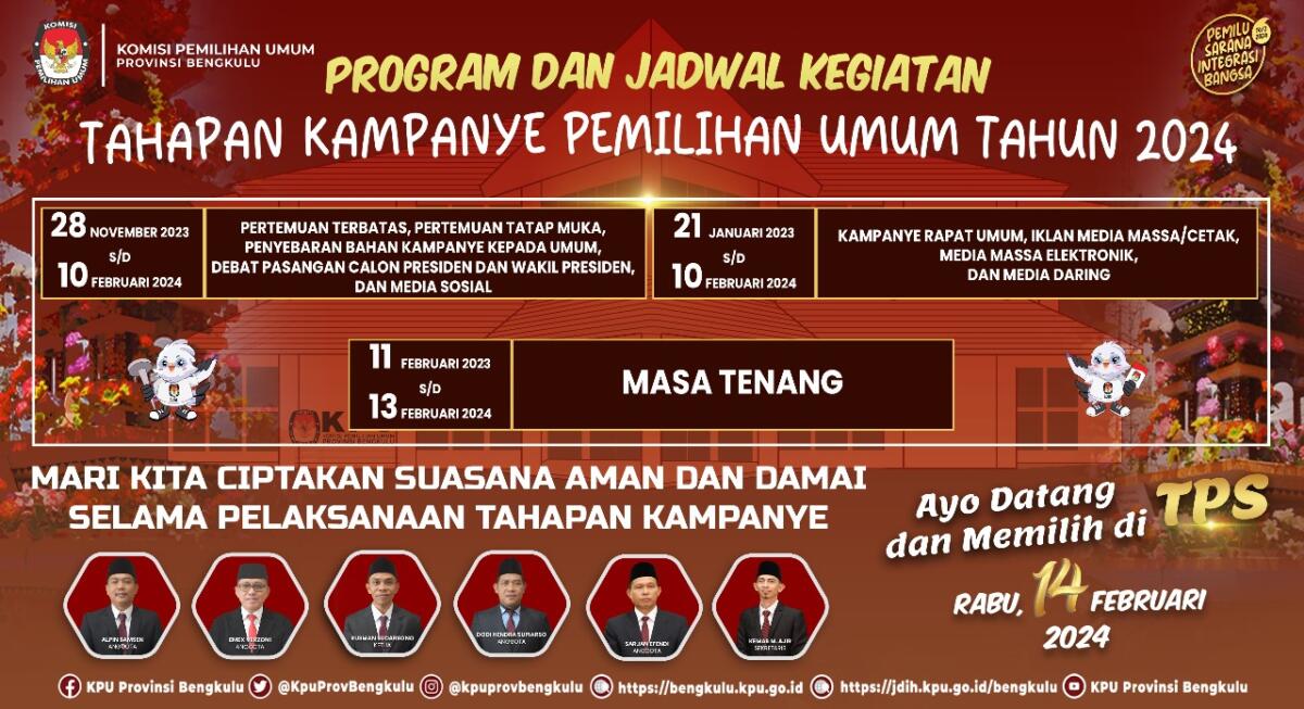 Beranda BANNER Program Dan Jadwal Kegiatan Tahapan Kampanye Pemilu 2024 BANNER, HEADLINE Program Dan Jadwal Kegiatan Tahapan Kampanye Pemilu 2024mediabengkulu - Jelang Pemilu 202426 Januari 202420 Februari 2024 Program Dan Jadwal Kegiatan Tahapan Kampanye Pemilu 2024. (foto:dok) Mari Kita Ciptakan Suasana Aman dan Damai Selama Pelaksanaan Tahapan Kampanye Ayo Datang dan Memilih di TPS, Rabu 14 Februari 2024 Baca JugaSekali Posting, Selamanya Tersimpan! Polisi Ingatkan Pelajar Bengkulu1.595 Personel Turun! Bali Siap “Kunci” Kemala Run 202611 Ribu Pelari Serbu Bali! Kemala Run 2026 Siap Pecah di Jalur Pantai GianyarBorong Dua Penghargaan, Humas Polda Bengkulu Bikin Heboh Rakernis Polri 2026Di Balik Seragam, Ini Cara Polda Bengkulu Menjaga Hati dan IntegritasRekrutmen Kopdes 2026 Dibuka, Ini Syarat dan Jadwal Lengkapnya