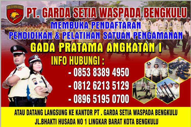 Bengkulu, mediabengkulu.co – PT Garda Setia Waspada Bengkulu resmi membuka pendaftaran Pendidikan dan Pelatihan Dasar Satpam Gada Pratama Angkatan Pertama Tahun 2026.