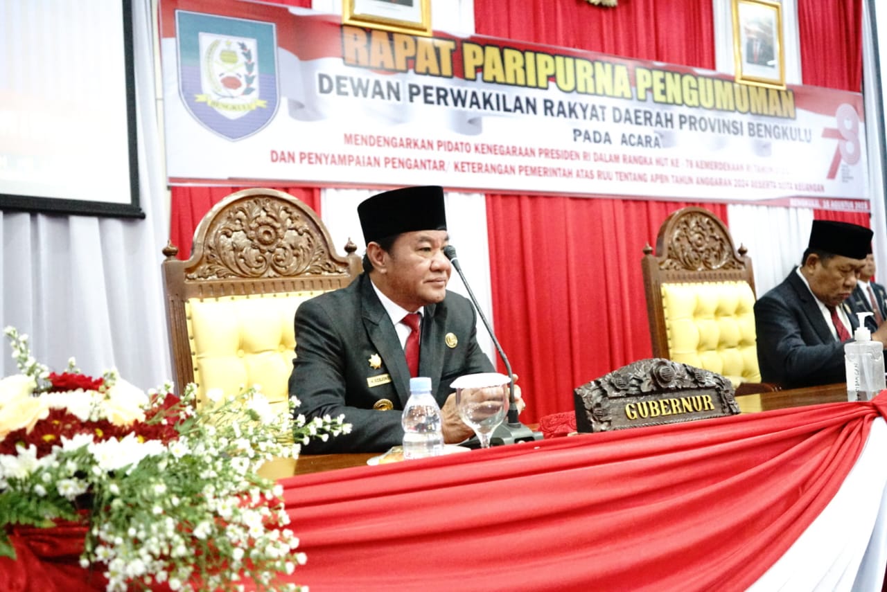 Bengkulu, mediabengkulu.co – Rapat paripurna istimewa Dewan Perwakilan Rakyat Daerah (DPRD) Provinsi Bengkulu dengan agenda mendengarkan pidato kenegaraan Presiden Joko Widodo dalam rangka peringatan HUT ke-78 RI, Rabu (16/8/2023).