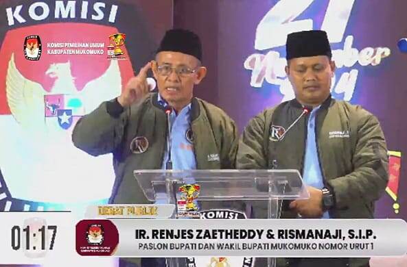 Mukomuko, mediabengkulu.co – Paslon Nomor Urut 1, Renjes Zaetheddy – Rismanaji, menarik perhatian dan dinilai unggul dalam debat perdana yang diselenggarakan oleh Komisi Pemilihan Umum Kabupaten Mukomuko di Hotel Mercure, Sabtu (9/11/2024).