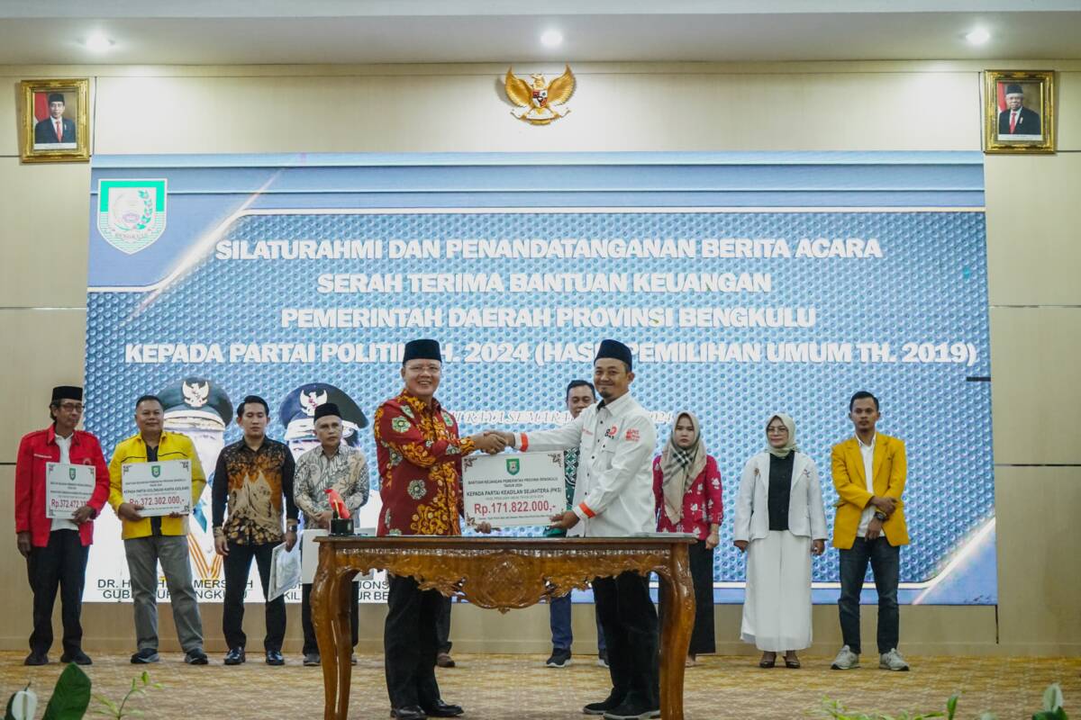 Bengkulu, mediabengkulu.co – Gubernur Bengkulu, Rohidin Mersyah, menyerahkan bantuan partai politik tahap pertama tahun 2024.