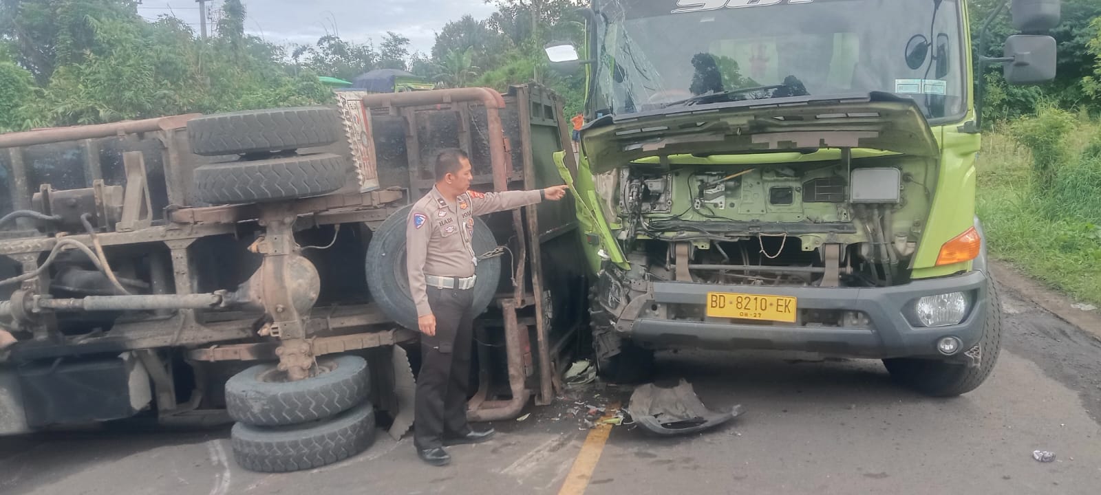 Kendaraan roda enam Hino warna merah mengalami rusak ringan, sementara Hino hijau mengalami rusak ringan pada bagian depan.