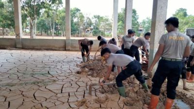 Brimob Polda Sumut Bersihkan Lumpur di Aula SMP Swasta Santo Fransiskus Pandan Pascabencana