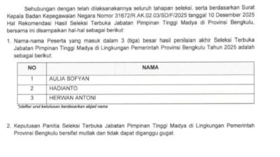 Bengkulu, mediabengkulu.co – Pemerintah Provinsi Bengkulu melalui Panitia Seleksi Terbuka Jabatan Pimpinan Tinggi Madya, resmi mengumumkan tiga besar peserta yang…