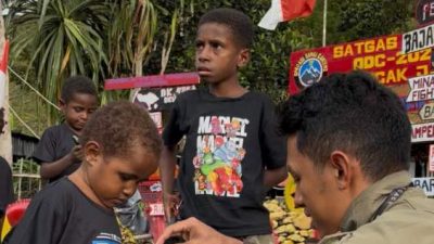 Personel Satgas Damai Cartenz Ajak Anak-anak Bermain di Pos Kulirik