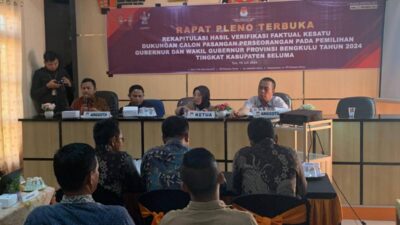 Seluma, mediabengkulu.co – Komisi Pemilihan Umum Kabupaten Seluma menggelar rapat pleno terbuka rekapitulasi hasil verifikasi faktual kesatu dukungan calon pasangan…