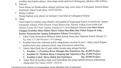 Seluma, mediabengkulu.co – Kantor Kementerian Agama Kabupaten Seluma mengeluarkan surat edaran nomor: 0482/KK.07.6.6/BΑ.03.2/03/2024, tentang hasil rapat penentuan qimad zakat fitrah…