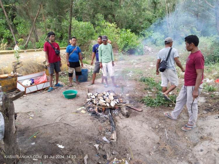 Dari siang hari hingga menjelang petang, hari ini di pesisir Muara Jelitik atau Muara Air Kantung nampak puluhan ibu-ibu yang merupakan istri para nelayan dibantu sejumlah pria nelayan yang belum turun melaut, nampak sibuk mempersiapkan makanan ala kadarnya.