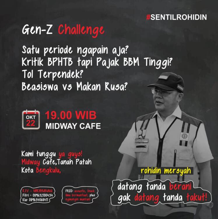 Bengkulu, mediabengkulu.co – Generasi Z (Gen-Z) secara tiba-tiba menyentil Calon Gubernur Bengkulu Nomor Urut 2 Rohidin Mersyah. Bertajuk “Bersama Teman Nongki Kita Tantang Rohidin Masuk Tongkrongan GEN-Z”.