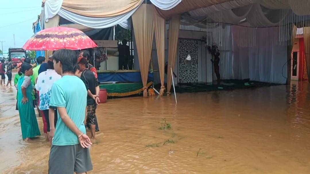 Tingginya debit air membuat pelaminan pengantin terendam air, sehingga seluruh perabotan dan dekorasi pelaminan pesta pernikahan diungsikan ke Balai Desa setempat.