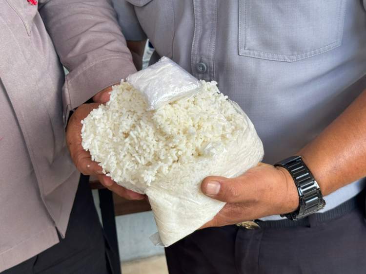 Ketika memeriksa kantong plastik putih berisi nasi milik SA, petugas curiga ada sesuatu yang disembunyikan.