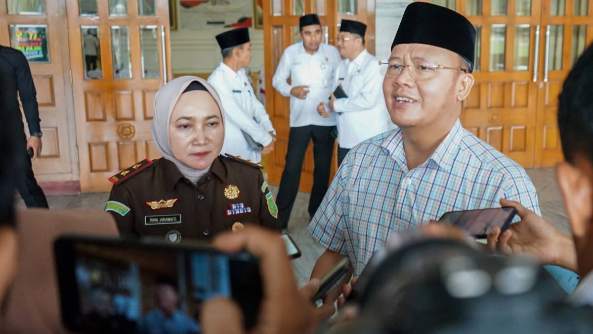 Gubernur Bengkulu, Rohidin Mersyah (kanan) dan Kajati Bengkulu, Rina Vitawati (kiri) saat diwawancarai usai rapat di Balai Raya Semarak Bengkulu (foto : istimewa)