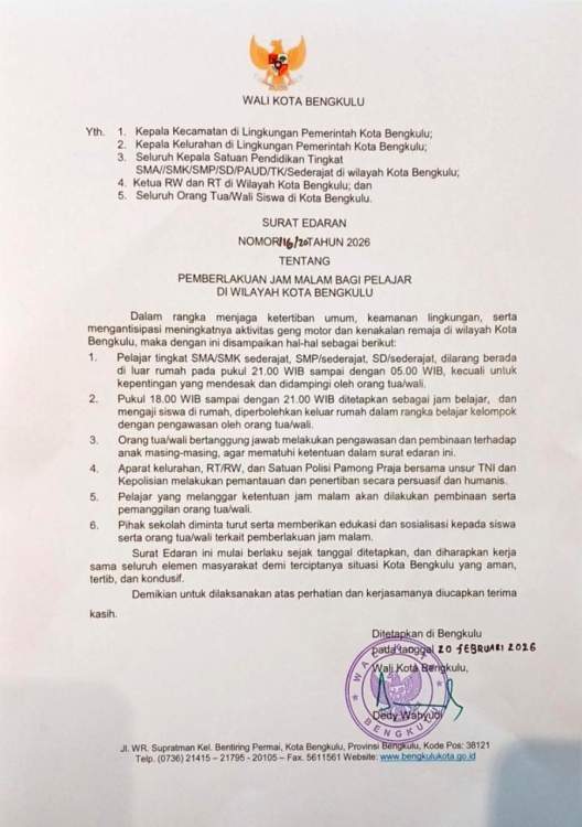 Kota Bengkulu, mediabengkulu.id – Wali Kota Bengkulu resmi menerbitkan Surat Edaran Nomor 16 Tahun 2026 tentang pemberlakuan jam malam bagi pelajar di wilayah Bengkulu.